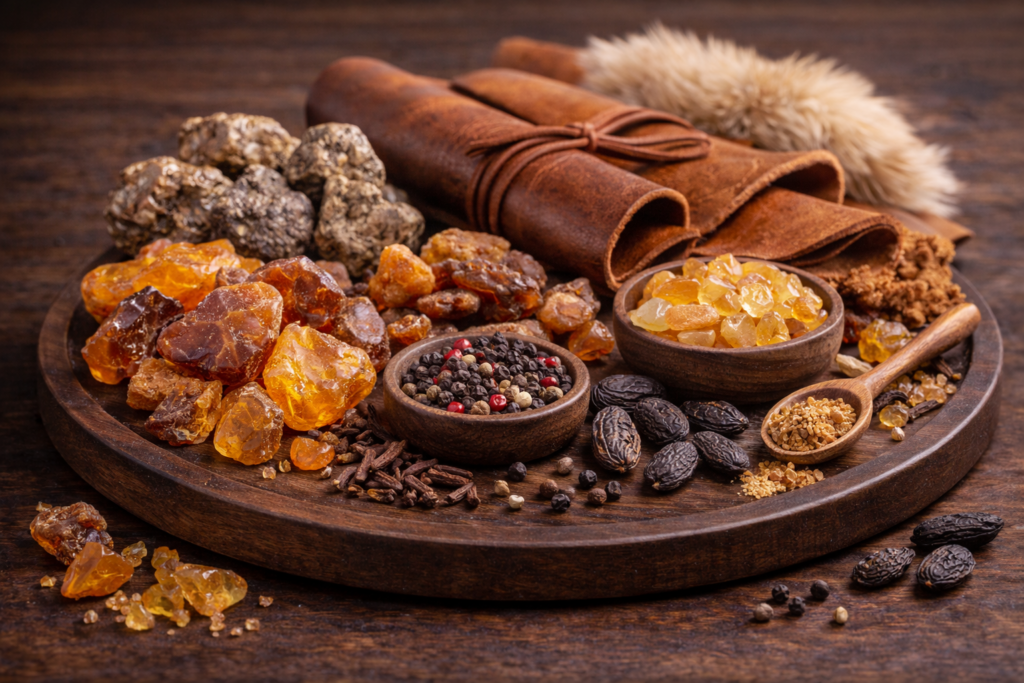 Meripihka, myski, tonka, bentsoe, nahka, hartsit.